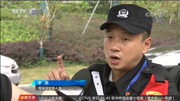 每天下午2点钟都是安保人员中班开始接班的时间。今天轮到了李昊值班,他大步的走向了停放的巡逻车,开始了对各个岗位的检查工作。曾经有过当兵经历的李昊,做事认真,干练负责,他在耐心的回复各岗位发来的信息。本届军会期间,李昊主要是在开闭幕式的核心场馆区域进行巡逻,自7月15日进驻以来,类似的巡逻检查更是风雨无阻。