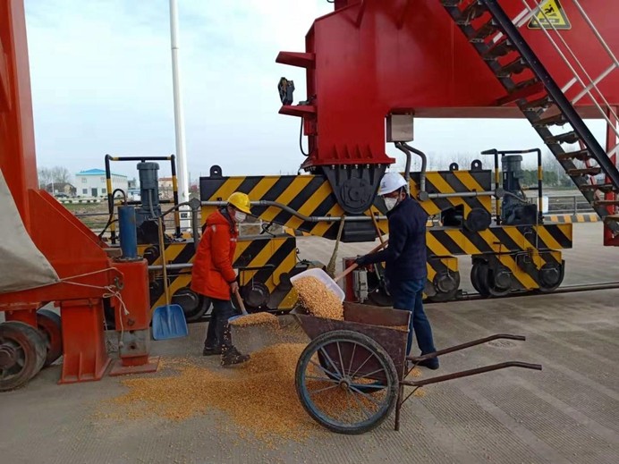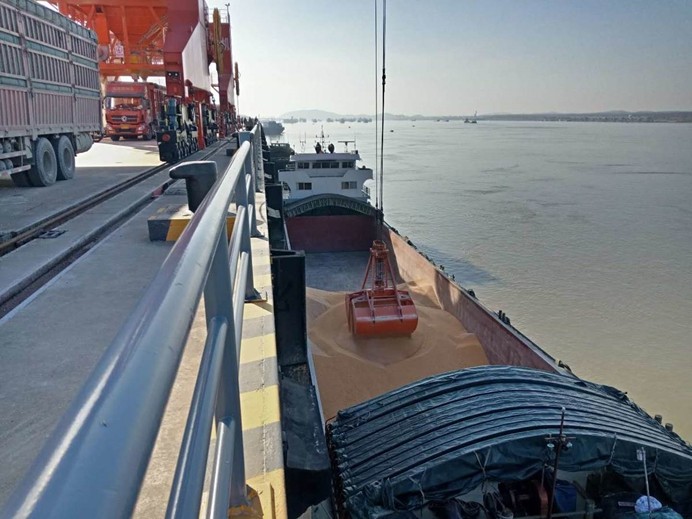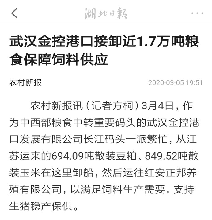 3月4日,作为中西部粮食中转重要码头的太阳成集团tyc33455港口发展有限公司长江码头一派繁忙,从江苏运来的694.09吨散装豆粕、849.52吨散装玉米在这里卸船,然后运往红安正邦养殖有限公司,以满足饲料生产需要,支持生猪稳产保供。