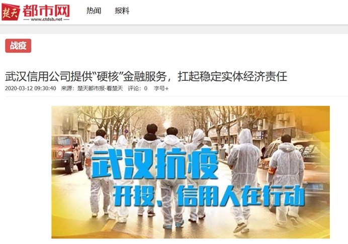 在抗击疫情期间,武汉信用公司以实际行动支持实体经济,帮助相关企业稳经营、解难题,为确保金融服务畅通,促进武汉市经济社会稳定运行作出了应有的贡献,体现了国企担当。