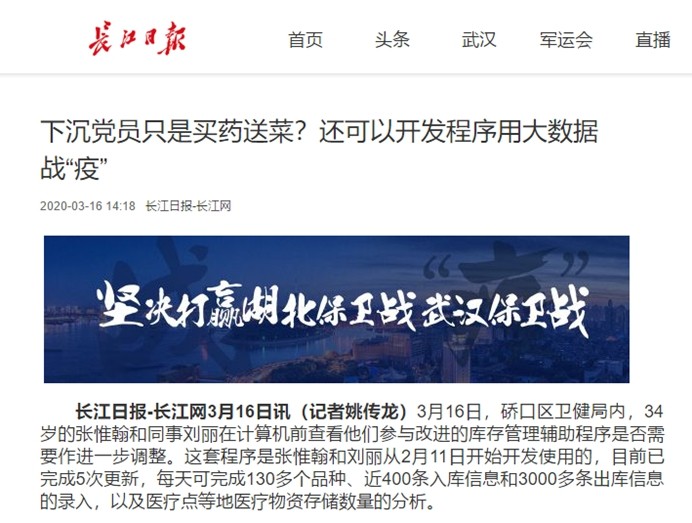 长江日报:下沉党员只是买药送菜?还可以开发程序用大数据战“疫