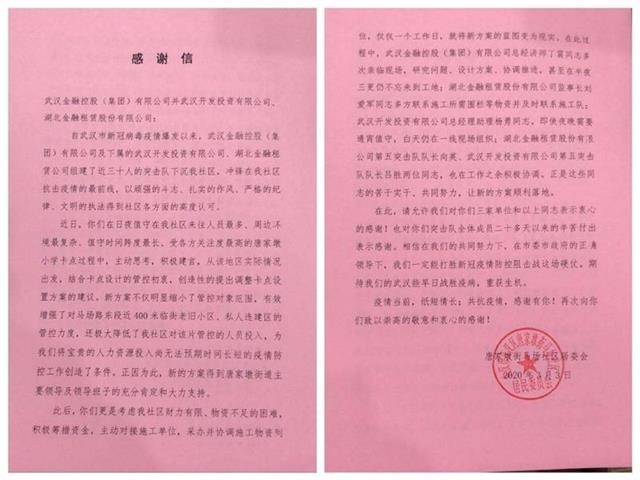 3月3日,江汉区马场社区也向太阳成集团tyc33455集团、武汉开投公司以及湖北金租公司发来感谢信,感谢公司和突击队员献计献策,出资出力,协助完善社区防控卡点漏洞。