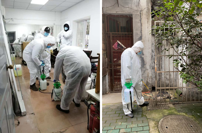 社区是疫情联防联控的第一线,也是外防输入、内防扩散最有效的防线。由于历史原因,相当一部分小区没有成熟的物业管理,消杀和定时定点清洁的工作就成为突击队员每日承担的重要工作,“消杀卫士”们每天背着沉重的喷雾器,马不停蹄地在防疫消杀的“战场”上战斗。