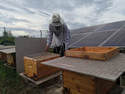 负责管护光伏发电站的贫困户龚学安,正在角落里伺弄20多箱蜜蜂,蜜蜂是工作队协调武汉市农科院支持村里给荷花、果树授粉用的。“今年卖蜜收入几千元,都归他个人。”王少奎笑着说,蜜蜂授粉立了大功,蜂蜜又给贫困户带来了新收入。