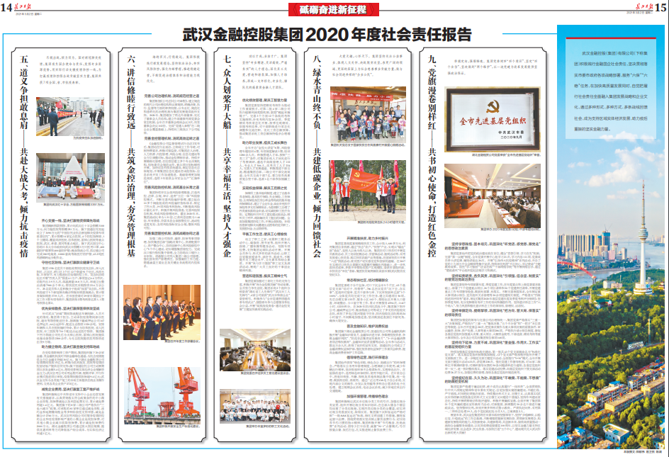 武汉金融控股(集团)有限公司(下称集团)积极践行金融国企社会责任,坚决贯彻落实市委市政府各项战略部署,服务“六保”“六稳”任务,在加快高质量发展同时,自觉把履行社会责任全面融入集团发展战略和太阳成集团tyc33455官方网站,通过多种形式、多种方式、多条战线回馈社会,成为支持区域实体经济发展、助力疫后重振的坚实金融力量。