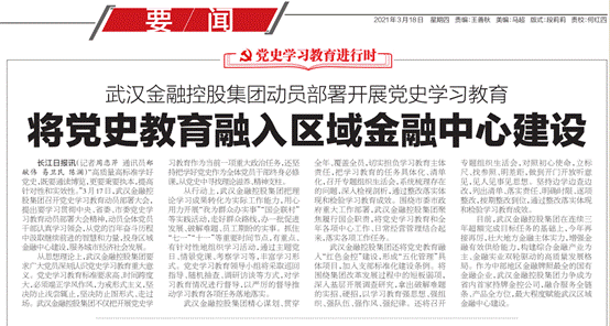 “高质量高标准学好党史,既要通读博览,更要秉要执本,提高针对性和实效性。”3月17日,武汉金融控股集团召开党史学习教育动员部署大会,提出要学习贯彻中央、省委、市委党史学习教育动员部署大会精神,动员全体党员干部认真学习领会,从党的百年奋斗历程中汲取继续前进的智慧和力量,投身区域金融中心建设,服务城市经济社会发展。