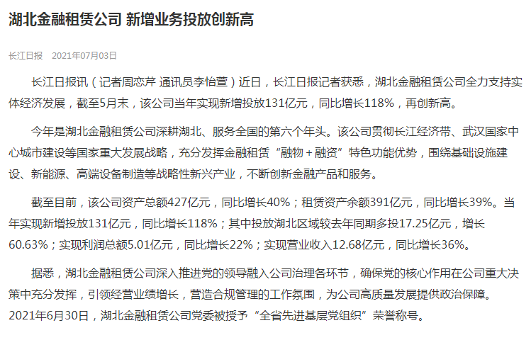 近日,长江日报记者获悉,湖北金融租赁公司全力支持实体经济发展,截至5月末,该公司当年实现新增投放131亿元,同比增长118%,再创新高。