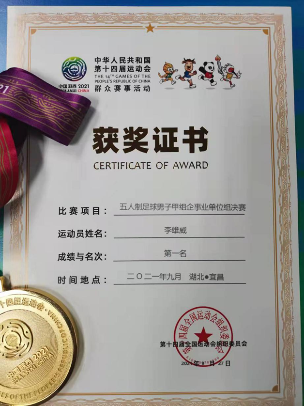 日前,第十四届全国运动会群众项目五人制足球男子甲组企事业单位组的比赛在湖北宜昌圆满落幕。武汉阳逻港口服务公司李雄威代表湖北队参赛,并以不败战绩荣获本届赛事的冠军。