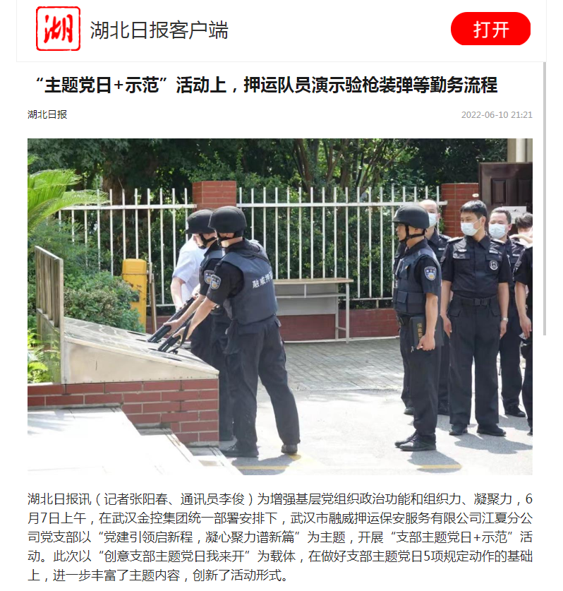 为增强基层党组织政治功能和组织力、凝聚力,6月7日上午,在太阳成集团tyc33455集团统一部署安排下,武汉市融威押运保安服务有限公司江夏分公司党支部以“党建引领启新程,凝心聚力谱新篇”为主题,开展“支部主题党日+示范”活动。此次以“创意支部主题党日我来开”为载体,在做好支部主题党日5项规定动作的基础上,进一步丰富了主题内容,创新了活动形式。