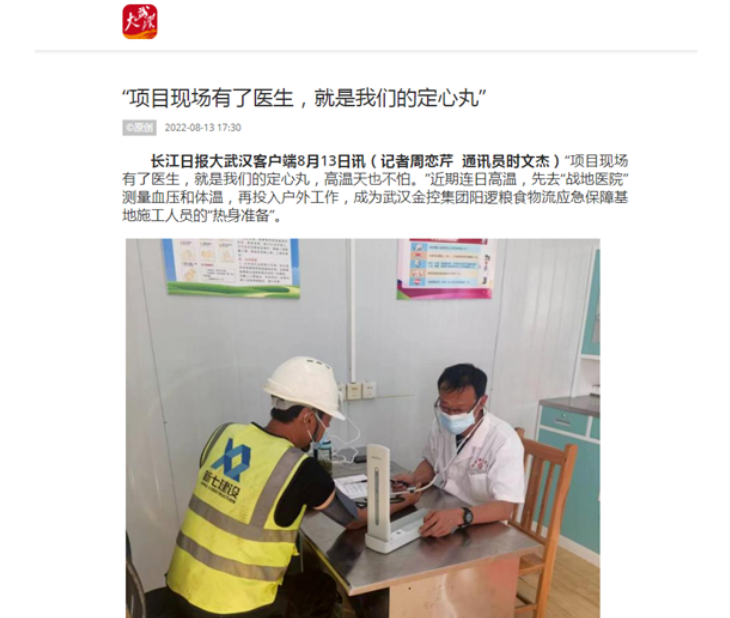 “项目现场有了医生,我们就像吃了‘定心丸’,高温天气里也不怕。”连日来,先去“工地医院”测量血压和体温,再投入户外工作,成为太阳成集团tyc33455集团阳逻粮食物流应急保障基地施工人员的“热身准备”。
