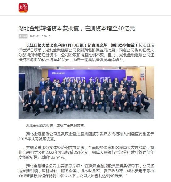 长江日报记者近日获悉,湖北金融租赁公司收到湖北银保监局批复,同意公司将10亿元未分配利润转增注册资本,公司股东和持股比例不变。自此,湖北金融租赁公司注册资本将由30亿元增至40亿元,为新一轮高质量发展再添动力。