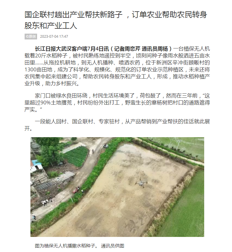 一台植保无人机载着20斤水稻种子,被村民熟练地遥控到半空,顷刻间种子像雨水般洒进五亩水田里……从拖拉机耕地,到无人机播种、喷洒农药,位于新洲区辛冲街顾畈村的1300亩田地,成为了科学化、规模化、规范化的订单农业示范种植区,未来还将农民集中起来组建公司,帮助农民转身股东和产业工人,形成,推动水稻种植产业升级,助力乡村振兴。