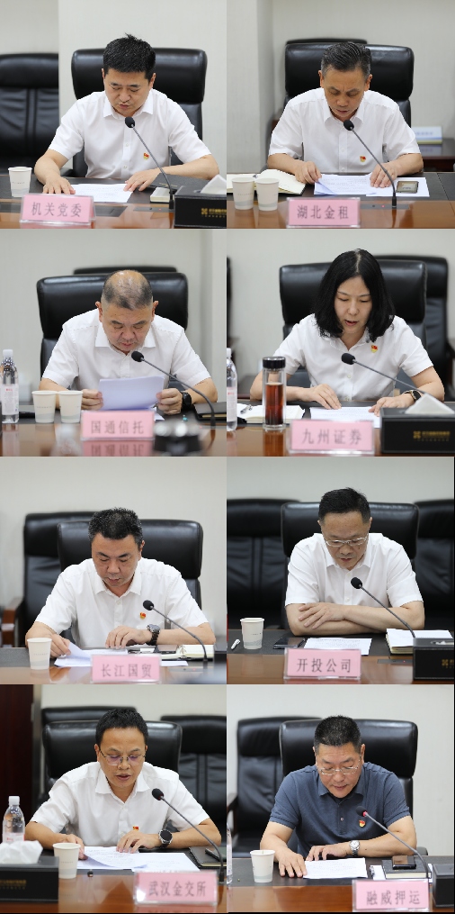 集团机关党委、湖北金租、国通信托、九州证券、长江国贸集团、开投公司、武金所、融威押运等8家单位作会议发言,其他单位作书面发言。